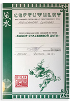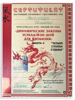 Основатель и руководитель интернет-магазина сувениров фэн-шуй Moy-Talisman.Ru. Провожу индивидуальные консультации и семинары в группах по методикам исполнения желаний (в том числе Карта Желаний). В своей работе использую в качестве вспомогательных инструментов знания в области фэн-шуй и Ба Цзы.